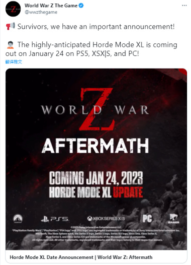 《殭屍世界大戰:劫後餘生》是一款射擊類動作遊戲,玩家將和最多三名隊友在世界各地阻擋喪屍進攻的浪潮,揭開全新故事篇章;近日 Saber Interactive Inc 官方發布消息,《殭屍世界大戰:劫後餘生(World War Z: Aftermath)》將於1月24日登陸PS5、XSX/S平台,玩家可以免費升級至次世代版本,遊戲支持4K/60 幀,除此之外,遊戲還將加入全新的「生存模式XL」,該模式將僅在PS5、XSX/S與PC版本作中可以遊玩: