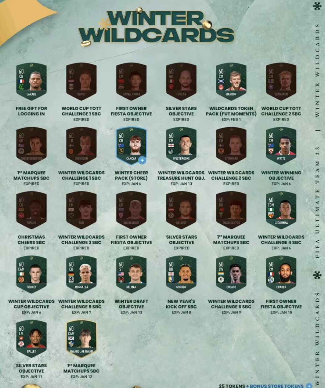 加上上邊提到的SBC和昨天新增的白銀之星,本次冬季外卡代幣的全部26張也已經落下帷幕。