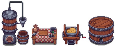 釀造啤酒、蒸餾烈酒並製作葡萄酒。製作完美的爽口拉格或是最烈的酸酒。你可以在遊戲中發現和製作出一系列的食物,酒和物品。在漫長旅程中,你可以獲得經驗來升級並進一步自定義角色。花費點數來升級自然、建造、烹飪、釀造、社交與魔法科技樹!