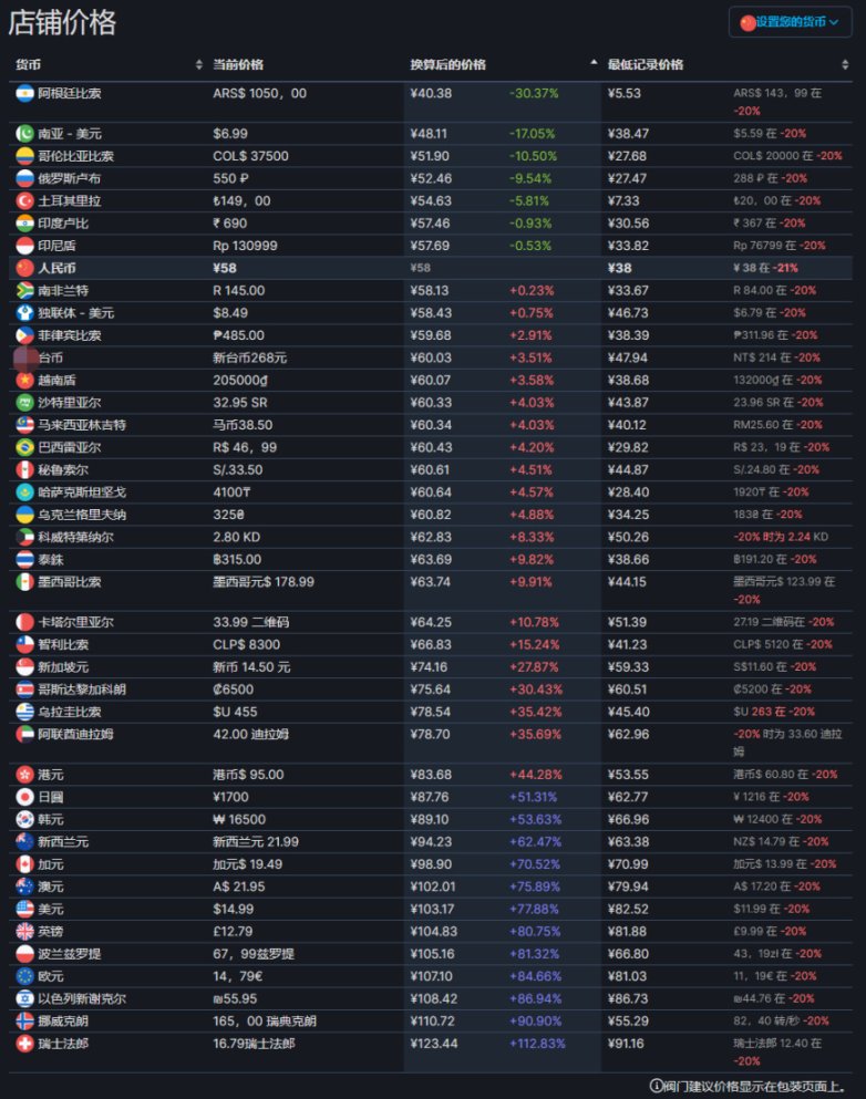 《旅者之憩》低價區價格暴漲,土耳其區25里拉(約¥9.16)↗149里拉(約¥54.63),阿根廷區179.99比索(約¥6.92)↗1050比索(約¥40.38)。