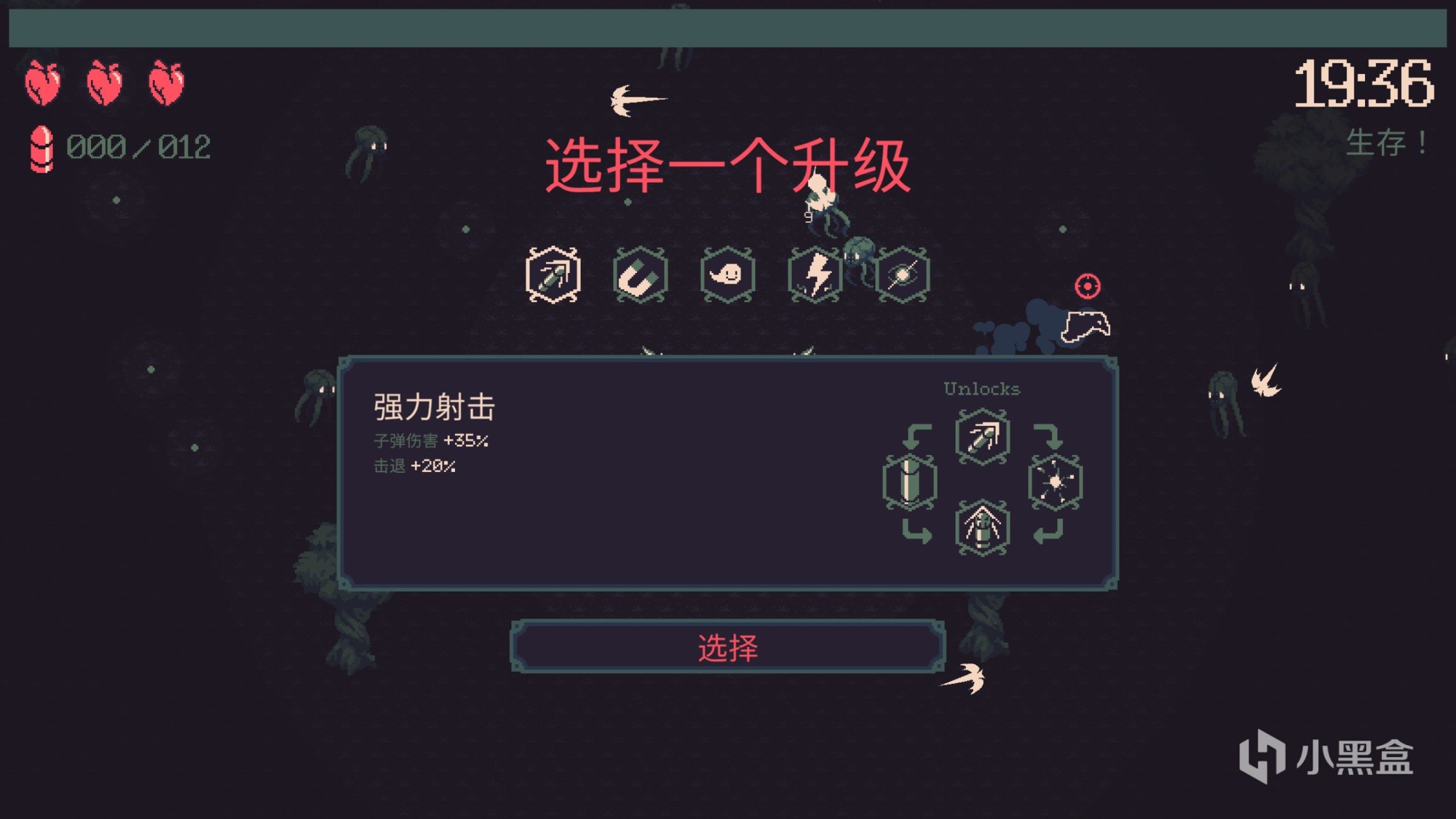 在關卡中你每擊敗一個敵人就可以搜集到一點經驗值,然後每次升級過後會有一次機會獲得新的能力(隨機刷出5個能力讓你選擇)。然後每個能力又有4個對應的成長階段,在選擇時右下角可以預覽,超過50種搭配任你選擇。遊戲中有兩大主流派,元素流和召喚流。元素流就是在升級的時候選擇讓子彈附帶冰霜、火焰等元素,冰火雷電,暴力突突突。召喚流派就是依靠召喚物來輸出,自己負責躲避敵人就好啦(瘋狂摸魚.jpg)。我個人感覺這遊戲其實更偏向於輕肉鴿,看起來好像選擇好多,玩個五把左右你就會發現其實到最後成型的流派就那麼幾個。