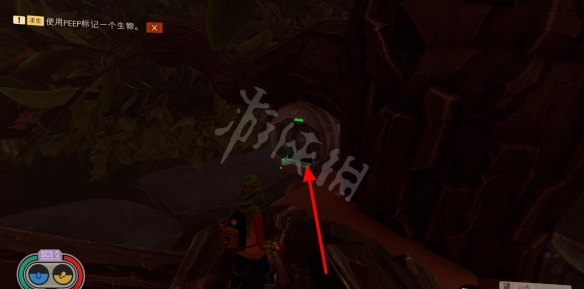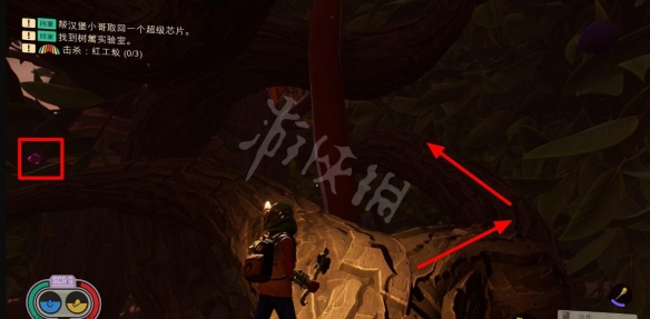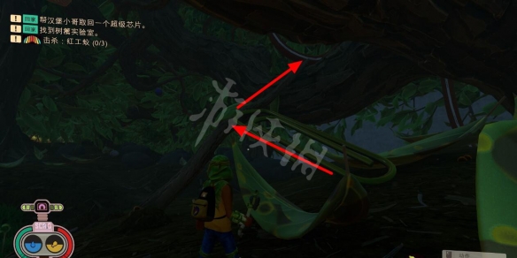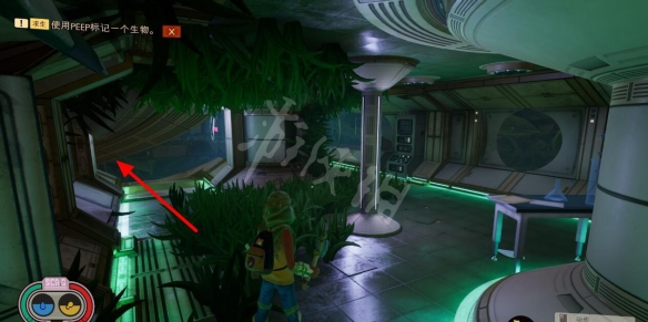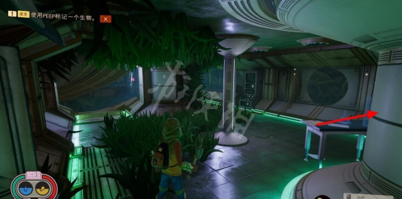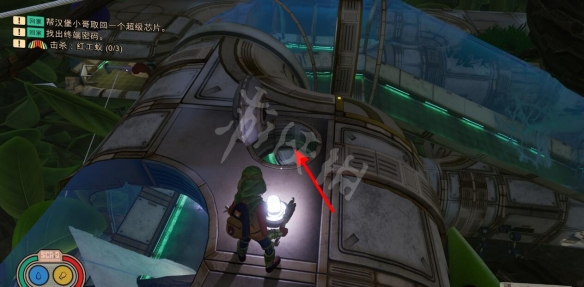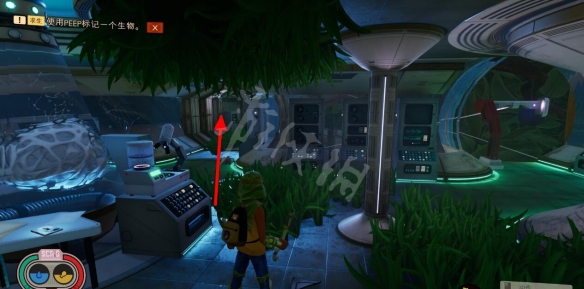 5、搜刮完畢前方的小屋從另一側的門離開後,沿著左側的樹枝前進。在前方通過蘑菇和葉子向上前進。使用滑索進入樹籬實驗室。在生物特徵掃描器上錄入生物信息獲得實驗室許可權,但使用系統還需要我們找到密碼。從右前方打開的門繼續深入實驗室。