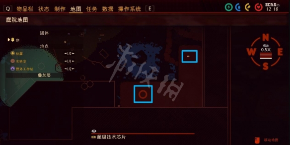 1、在地圖上可以看到超級晶元位於庭院東南角附近,而我們則需要前往晶元西南側。