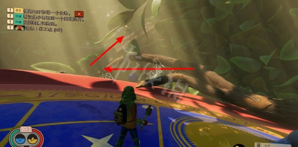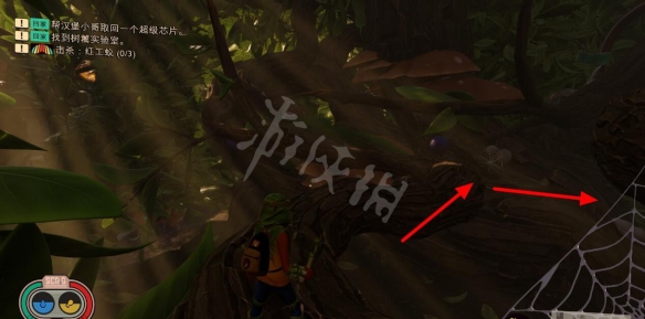 4、在前方跳至下層長蘑菇的樹枝上後向右走。在蜘蛛網囊旁向前到達小屋。搜刮一番小屋後沿著門前的樹枝繼續前進。通過左側的蘑菇繞至後方。使用滑索繼續前進。沿著樹枝到達前方的飛盤上。通過另一側的樹枝向前再次使用滑索。