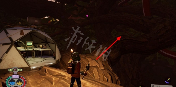 2、來到目標位置後可以看到一個巨大的回形針,通過回形針上到高處的樹枝上。來到樹枝上後右轉再右轉。在樹枝上我們可以找到1個野外工作站,隨後在工作站門前右轉沿著樹枝繼續前進。