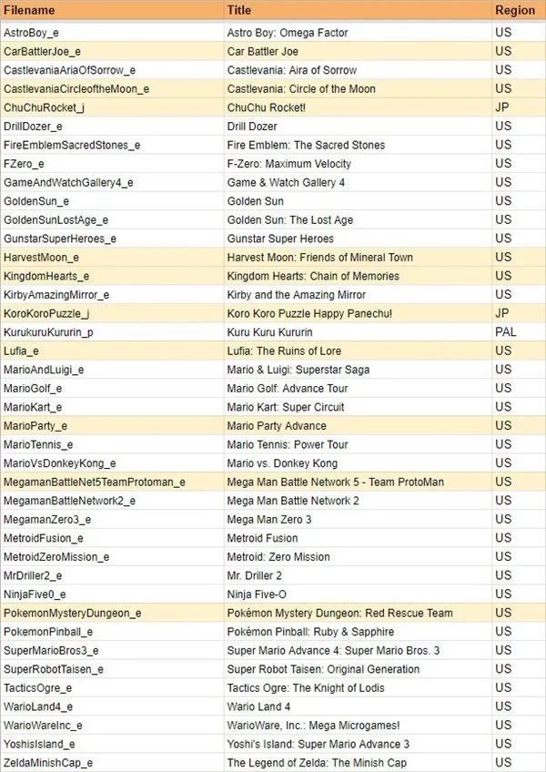 這些文件中顯示大量Game Boy Advance游戲已經在模擬器上進行了測試,雖然這並不意味著它們中的任何一個都一定會在未來出現,但該列表包括諸如《馬里奧》《塞爾達傳說》《銀河戰士》《火焰之紋章》和《洛克人》等游戲。