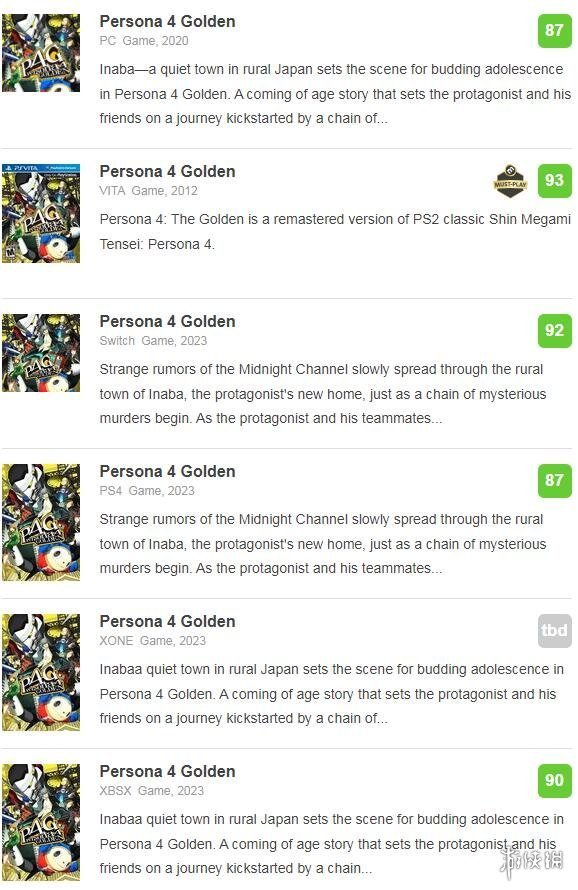 《女神異聞錄4 黃金版》metacritic媒體評分已公布,各個版本的評分有所不同。