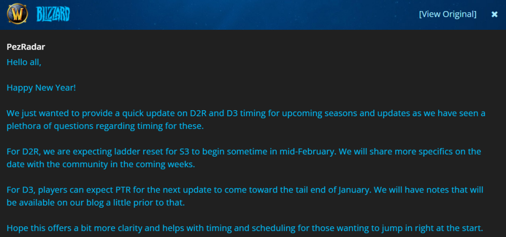 最近在官方以及Reddit論壇,暴雪暗黑破壞神社區經理Adam 'PezRadar' Fletcher簡單介紹了暗黑2重製版和暗黑3的下一步更新計劃,以及玩家在1月和2月期間可以期待什麼。