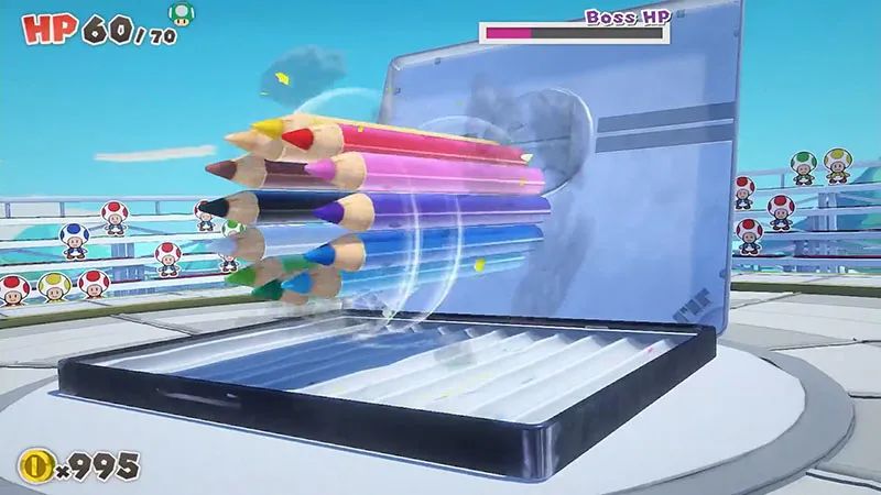 例如在官方演示中BOSS就是彩筆盒,馬力歐將彩筆盒用鎚子敲合後,彩筆盒沒法自己打開,它的武器彩筆就會在盒內爆炸,對其本體造成大量傷害。