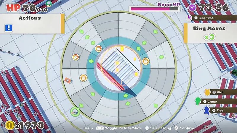 BOSS戰同樣可以召喚奇諾比奧,奇諾比奧會直接在舞台上標出馬力歐的行進路線,讓玩家更直觀的轉動圓環,不過行進路線只能顯示一回合。
