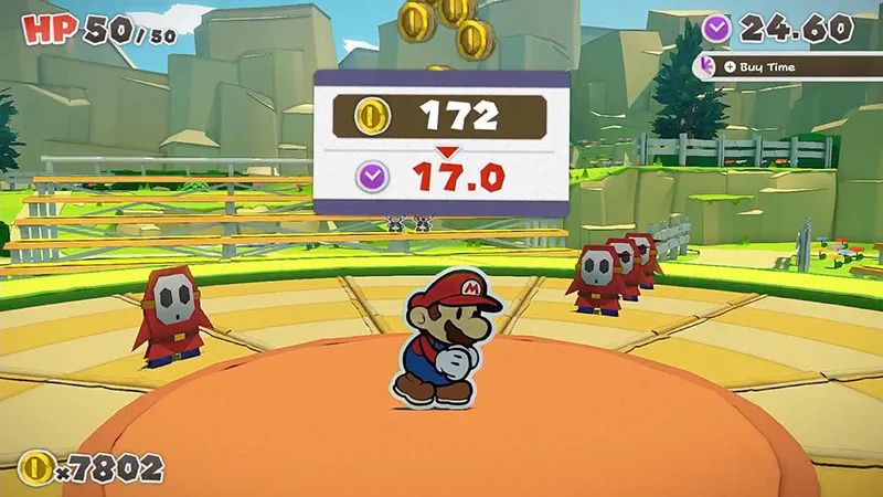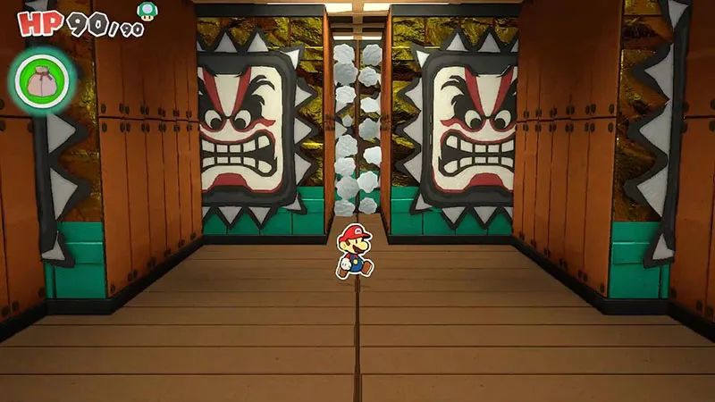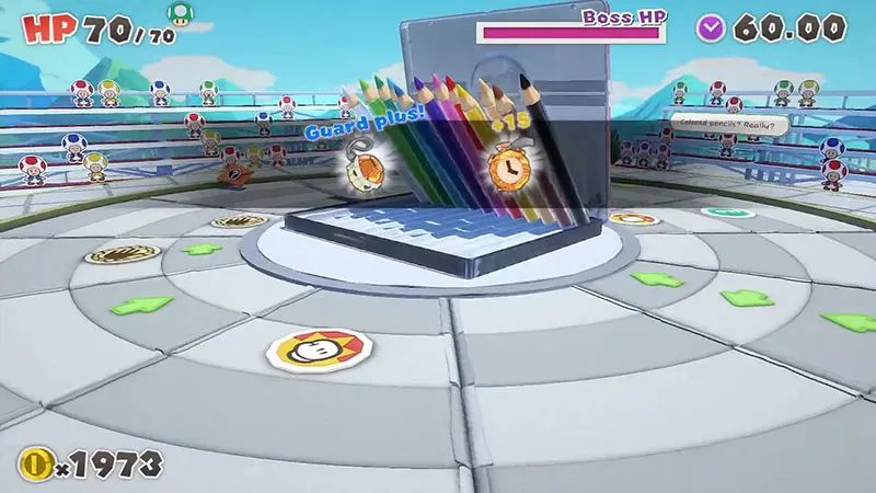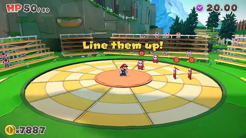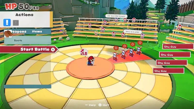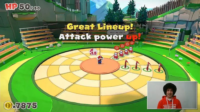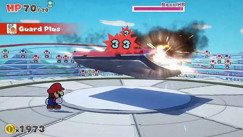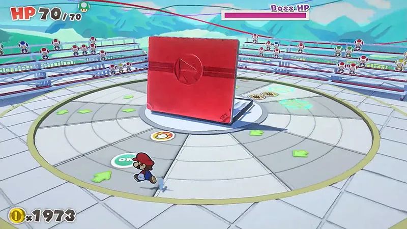 《紙片馬力歐:折紙國王》在BOSS戰里,BOSS站在圓環中央,而馬力歐站在圓環之外。在官方視頻演示中展示了BOSS戰前會有屬性加成,我推測這和裝備或收集物有關。