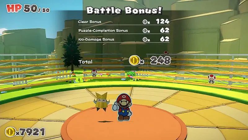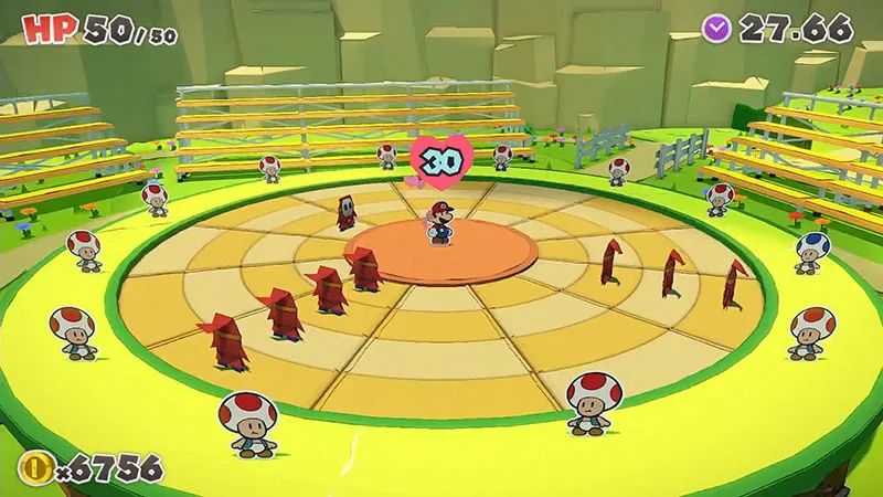 本作的舞台機制,似乎是回歸了NGC《紙片瑪利歐:千年之門》的舞台機制,不過在加入了圓環系統後,明顯讓戰鬥更加有趣了。