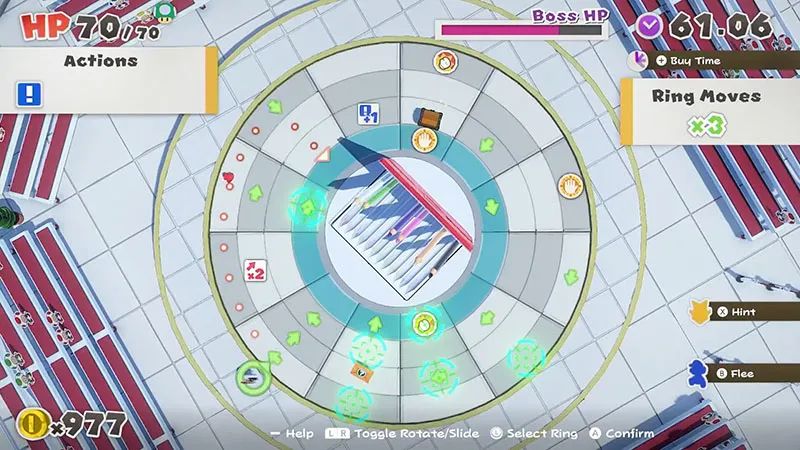 在戰鬥之前,馬力歐能夠旋轉圓環,既可以上下移動圓環,也可以左右移動圓環。