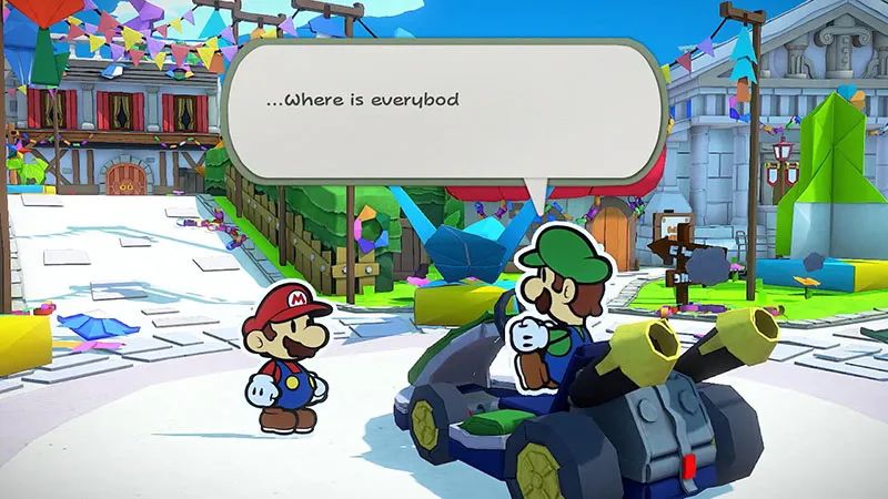 《紙片馬力歐:折紙國王》的遊戲開場依然是玩家們熟悉的紙片蘑菇王國,馬力歐和路易吉坐著卡丁車入場。不過本作路易吉似乎依舊沒啥存在感,僅僅是在開頭露面。
