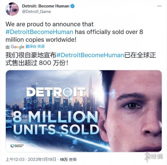 互動式電影游戲《底特律:化身為人》官方今日宣布,本作全球累計銷量已破800萬份。