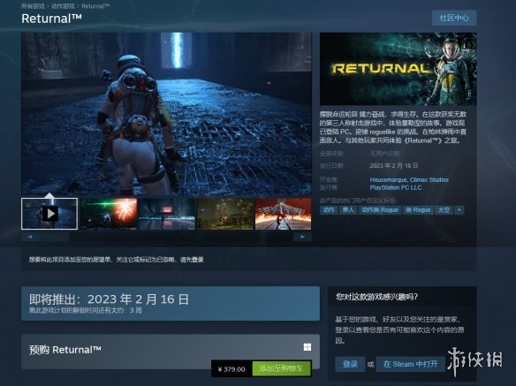 原PS5獨占科幻射擊游戲《死亡回歸(Returnal)》今日在Steam平台開啟預購,國區標準版售價379元,將於2月16號發售,顯卡最低要求為GTX1060。