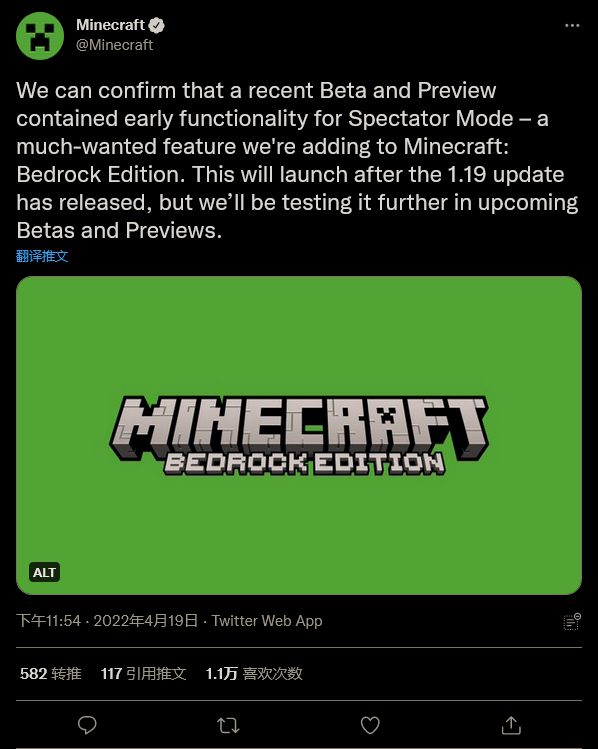 但是,開發商 Mojang 表示,該特定版本的「旁觀者模式」還不是完成版本。官方提醒玩家,目前該模式仍在開發中,並不是特別可靠。考慮到這一點,《我的世界》基岩版計劃在即將到來的 1.19 Wild 更新之後再上線該模式,不過該更新要到今年晚些時候才會發布。