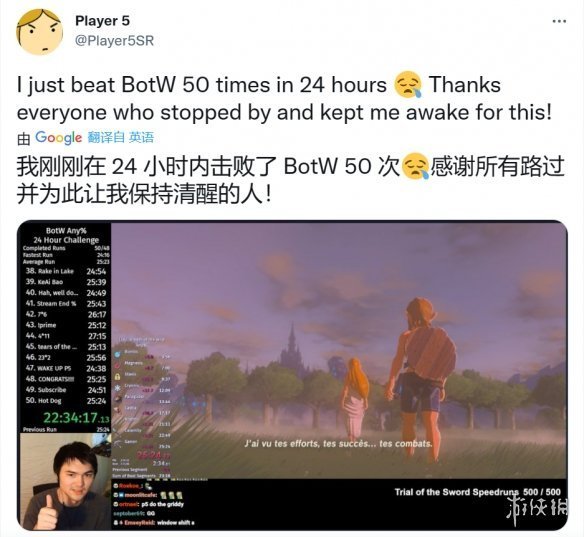 具體來說,Player 5連續直播了22小時53分52秒,再此期間他通關了50次《荒野之息》,最快24 分16 秒通關,平均 25 分 23 秒通關。Player 5還是《荒野之息》的速通世界記錄保持者(23:51),也刷新了他之前的記錄。