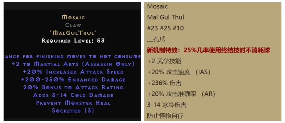 然後是刺客爪子,最高只用25號符文很便宜,主打高ED,高技能(2武學配底材技能),就是攻速少一些。此爪主打技能是「25%幾率使用終極技不消耗球」,兩把爪子疊加能達到50%效果,感覺還是偏低一些,要改到雙爪100%才好,畢竟瘟疫爪太實在厲害,總要帶一把。另外,武學刺客在現版本的體驗很一般,除非增加專屬的BUFF位監控,否則總是觀察身上有沒有球的話是非常影響流暢度的(傷眼睛),即使拿了雙爪。
