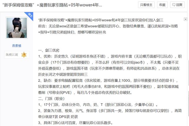 這種行為最開始或許是玩家們自發組織起來的。比如早在一兩個月前,百度「劍網3吧」「激戰2吧」等貼吧內,就一度風靡過「接收魔獸難民」主題的發帖。這些遊戲的玩家們,除了敞開大門熱烈歡迎魔獸難民外,還為其製作了相當詳細的新手入門攻略,用心程度可見一斑。