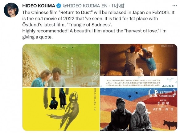 隨後,小島監督著重推薦了國產電影《隱入塵煙》,表示這是他看過的2022年最好的電影之一,和奧斯特倫德的最新電影《悲情三角》並列第一,這是一部關於「愛的收獲」的美麗電影。