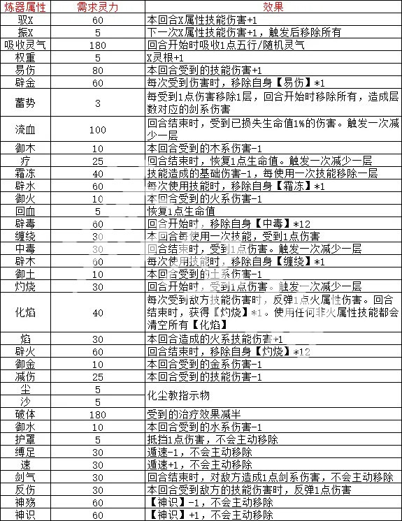 但是大多數裝備效果不共享靈力。例如地陰金和地陰混元做的劍都有易傷的效果,易傷80靈力一點。但是計算易傷靈力的時候分開計算,這時就會有零頭被向下取整吞掉,可能會出現明明有160靈力,但是易傷卻不足兩點的狀況。所以做單一屬性裝備最好用單一屬性材料。