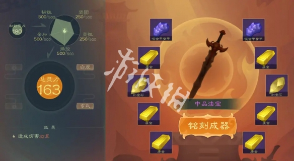 例如正常法寶靈力為180,圖中由於五維總和只有2000,不足2200,所以靈力只有163,法寶品質也無法達到上品,只有中品。