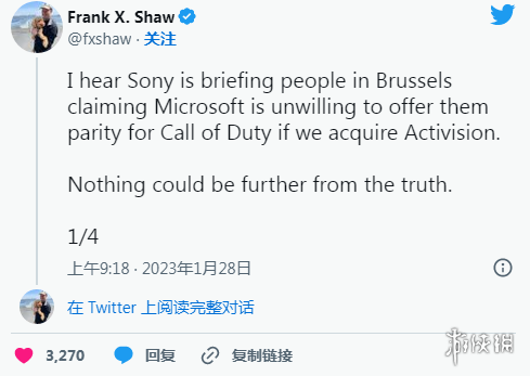 微軟首席傳播官Frank X. Shaw寫道:「我聽說索尼在布魯塞爾向人們通報說,如果我們收購了動視就不願意在《使命召喚》上為他們提供平等待遇。」