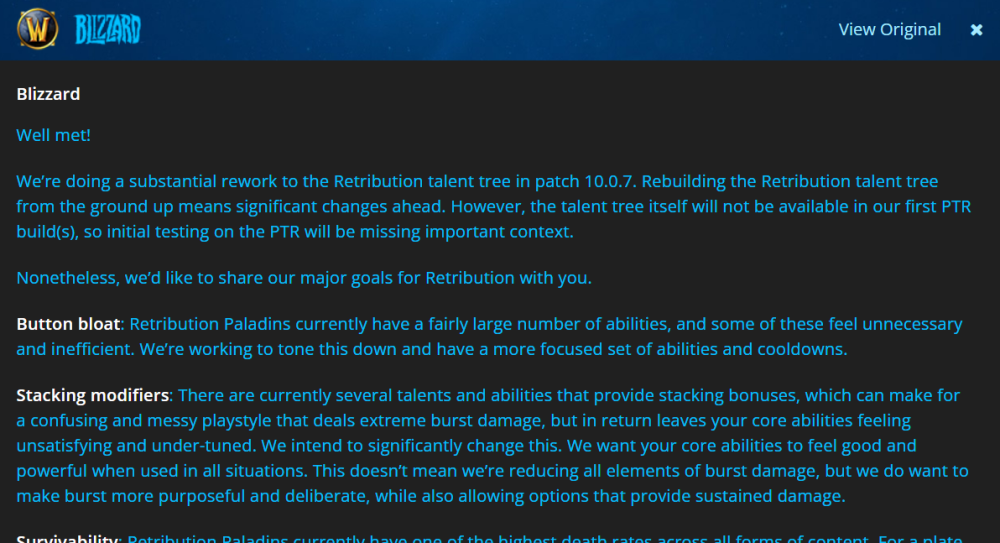 懲戒騎將在《魔獸世界》正式服迎來「新生」,暴雪在1月27日的論壇藍貼中宣布將對聖騎士的懲戒天賦進行回爐重製,此消息是在10.0.5補丁上線三天之後放出。