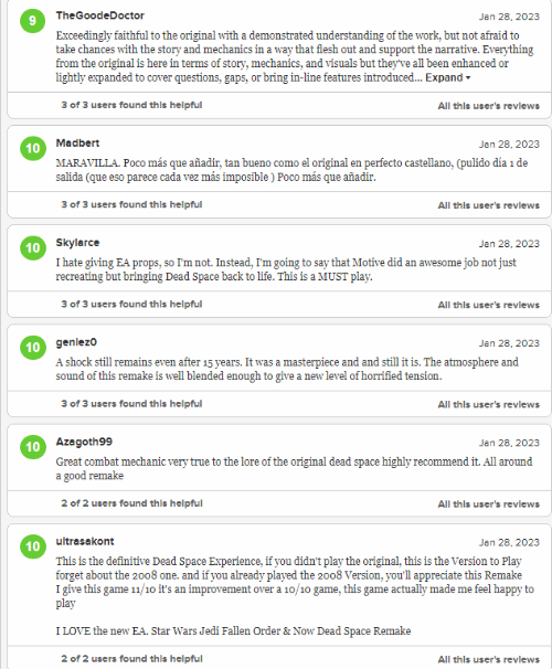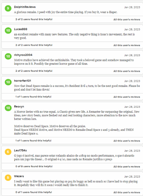 給出好評的玩家認為,「重製版的一切都近乎完美,這是享受死亡空間的最佳方式」「我未曾玩過原版遊戲,我體會到了這款經典遊戲的恐怖感,無論氛圍還是生物設計」「最好的恐怖動作遊戲之一,經典之作的重大升級」「遊戲非常忠實於原作,重製版新增的內容和機制充實了整個遊戲。」