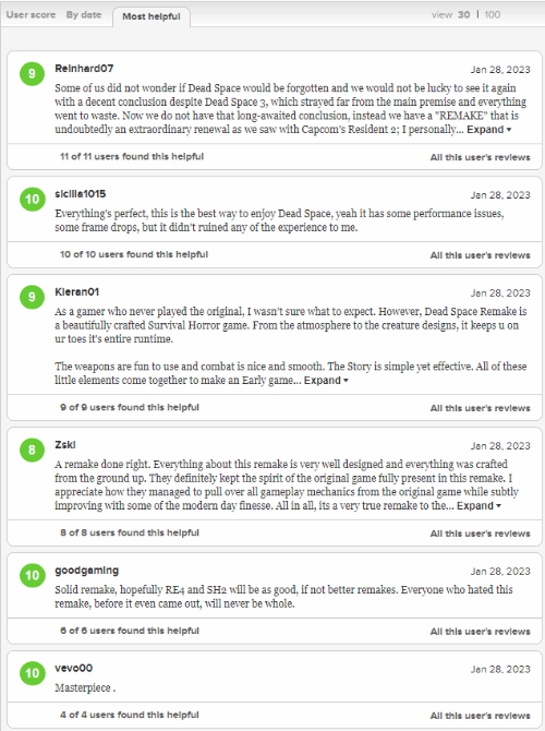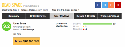 今日(1月29日),截止撰稿前,經典恐怖遊戲《死亡空間:重製版》在metacritic獲得了9.2的用戶評分,在90條評論中,83人給出好評,3人中評4人差評。