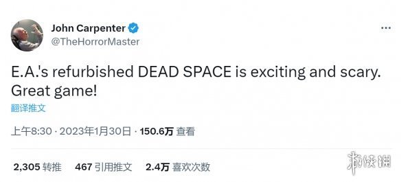 傳奇恐怖題材電影導演 約翰·卡朋特 (John Carpenter 代表作《怪形》等)今日在推特盛贊了《死亡空間重製版》,稱被EA翻新後的《死亡空間》既讓人興奮又令人恐懼,這是一款偉大的游戲。