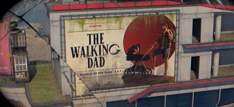 說到致敬,作為一款喪屍題材的遊戲,似乎怎麼也繞不過《行屍走肉》這部經典作品。有時可能玩家只是在磨練自己的滑翔傘技術,就會無意中看到旁邊大樓的致敬內容: