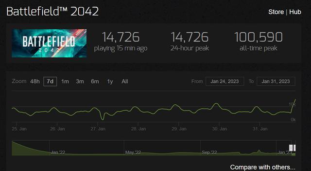 得益於這次更新,《戰地2042》Steam在線有了大幅度上漲:從更新前的平均6000人漲至當前的1.47萬人。