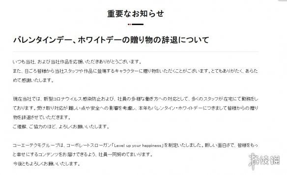 光榮特庫摩發布公告提醒了玩家今年不要寄送情人節和白色情人節禮物,並對玩家們一直以來的支持表示了感謝。光榮特庫摩旗下擁有多款游戲:《死或生》、《真三國無雙》、《煉金工房》、《安琪莉可》、《金色琴弦》等,游戲中有大量玩家喜歡的角色,每到情人節和白色情人節時,都會有玩家向光榮特庫摩郵寄送給游戲角色和游戲開發者的禮物。