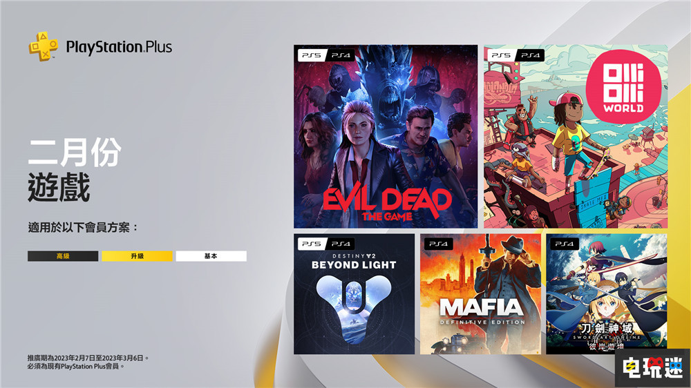 SIE香港今天公開了2023年2月PSN港服PS Plus全檔會員免費遊戲陣容。春節之後的2月,港服又當了一次「親兒子」,PS Plus會免陣容比起歐美服多了一款一共送了5款遊戲。包括港服額外贈送的遊戲里玩遊戲的「粉絲向」《刀劍神域 彼岸游境》PS4版,經典駕校模擬,「別惹計程車司機」《四海兄弟 最終版》PS4版,FPS資料片《命運2 凌光之刻》PS4版,滑板平台動作遊戲《奧力奧力世界》PS5與PS4版,非對稱恐怖生存遊戲《鬼玩人 遊戲版》。PS Plus玩家可以自2023年2月7日至3月6日期間領取。