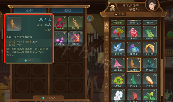 三、然後玩家就能看到三品葯材五柳根出售,需要花費405顆靈石購買就能獲得。