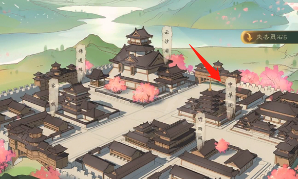 一、在覓長生里,玩家需要先花費五顆靈石做傳送陣抵達雲汐城,然後進入中草閣(下圖箭頭所指)。