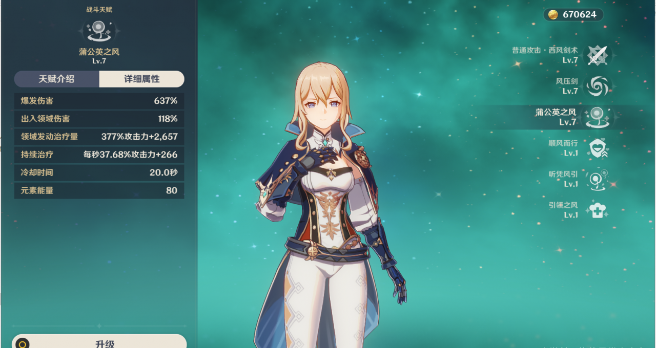 以自身為中心造出和風涌動的蒲公英領域,對周圍的敵人造成風元素傷害,並基於琴的生命值上限為附近的友軍與隊伍中的所有角色恢復生命值。蒲公英領域會持續為其中的角色施加風元素效果並恢復生命值,並對出入領域的敵人造成風元素傷害。