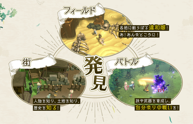 「發現的樂趣」對《聖塔神記》來說是最大的關鍵詞,遊戲將自身主要的玩法賣點濃縮為了「三大發現」——分別體現在野外、城鎮與戰鬥上。