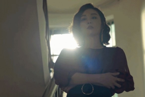 說實話,陳書婷第一次出場時就給我非常深刻的印象,她站在樓梯上,穿紅色絲綢上衣,背後有陽光透過來,光影明暗交錯,神秘又危險的壞女人形象一下子立住了。