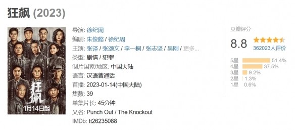《狂飆》的口碑與收視就一路狂飆,豆瓣評分8.9,還成為愛奇藝站內最快破萬的作品,還穩穩拿下了央視黃金檔收視冠軍。