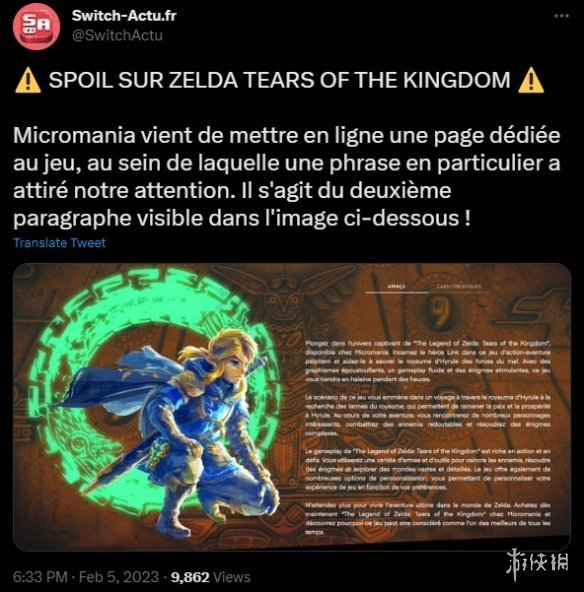 令玩家期待已久的《塞爾達傳說:王國之淚(The Legend of Zelda: Tears of the Kingdom)》將於5月發售,近日也有消息稱在2月任天堂舉辦的直面會中本作也將進行演示。玩家們都很好奇在前作救出塞爾達公主後,林克他們還會經歷怎樣的故事?目前來自法國的零售商泄露了遊戲的部分情報,讓我們一起來看看吧!