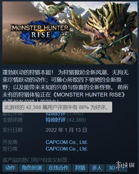 《怪物獵人崛起:曙光》目前在Steam上的總評價為「特別好評」,總計42388篇用戶評測中,好評率達到了86%,可以說是一款很優秀的游戲了。
