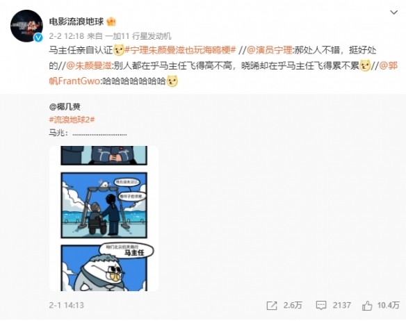 比如官方微博電影流浪地球,對電影的宣傳工作可謂是樸實無華,沒有全篇錯別字的宣傳海報也沒有張冠李戴曲解名言,只是非常接地氣又極其敏銳地抓住了馬鷗梗,收獲了廣大網友的一致好評。