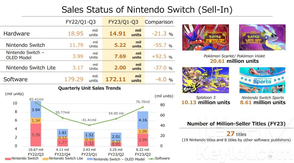 18、任天堂公布22-23財年Q3財報,Nintendo Switch銷量1億2255萬台,《寶可夢 朱 / 紫》售出2061萬份
