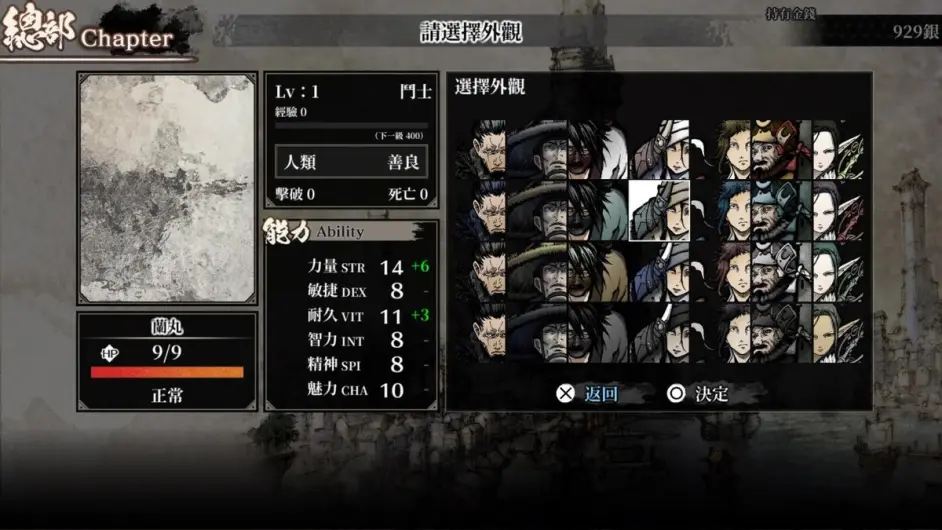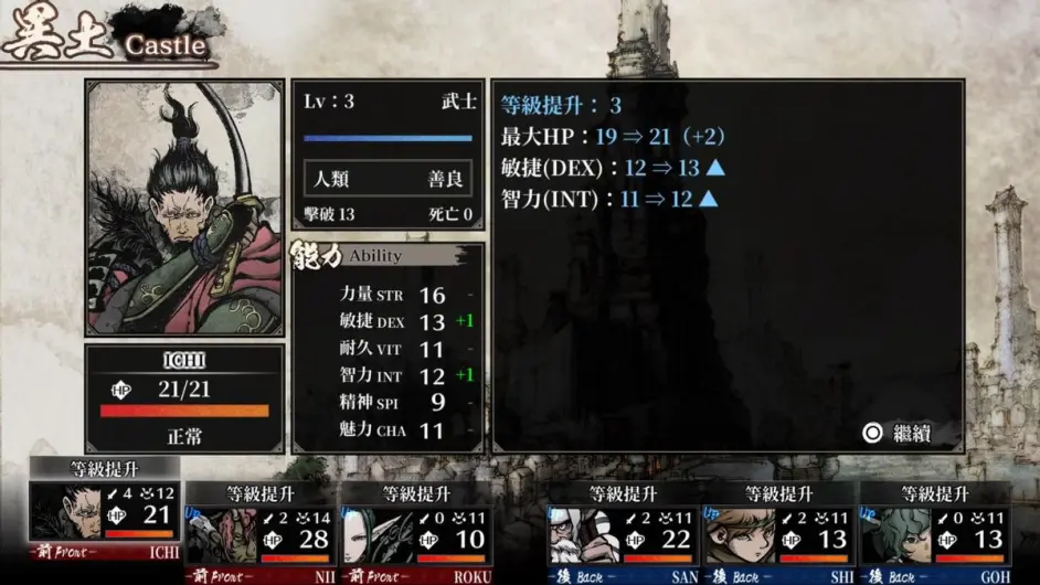 遊戲在職業方面,算是DRPG里比較少的,一共只有6個基礎職業和3個高階職業——當然了,存在轉職設定,轉職以後可以保留原職業的技能,算是可以通過組合來豐富玩法。6個基礎職業中,戰士(偏肉)、武士(更偏輸出)、僧侶(半肉半輔助)算是前排;牧師(輔助與恢復)、法師和盜賊算是後排。高階的白騎、忍者、賢者則分別代表了力、敏、智的可進化方向。