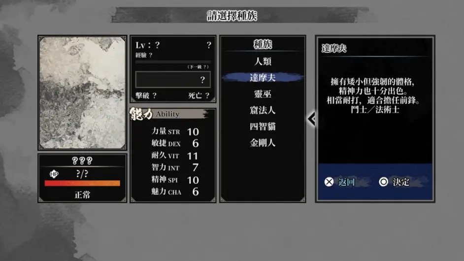 在六大人種中,普通人的基礎素質在前期基本是最一般的,因為所有屬性8魅力10的基礎意味著擔任哪個職位都不會太突出。達摩夫相當於矮人,魅力敏捷(命中與閃避)智力(法傷)低下,體力(血量)力量(傷害)精神(法抗)較高。靈巫顧名思義——高智力體力無能角色。窟法人則大概可以認為是《博德之門》中的賊法,可以作為一個輔助法系的半輸出位。四智貓則屬性相對更為平均,類似一個偏敏智的人類。金剛人則是力敏體拉滿其他三項為5(太低的屬性升級時甚至可能會減少)。