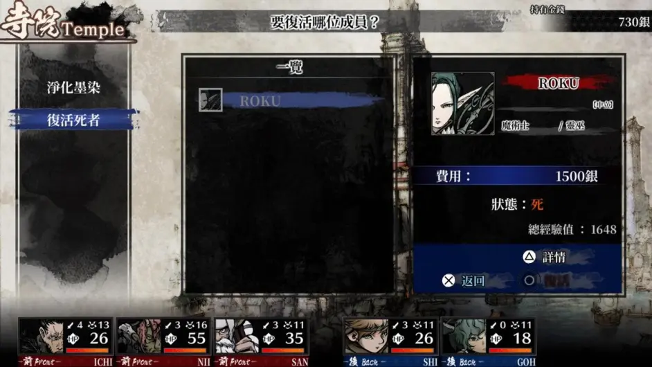 寺院復活費用非常昂貴(每等級500),且有失敗風險——失敗會永久死亡人財兩空,前期如果死人了建議放棄直接去總部招募頂替,因為本作並不存在時間壓力,哪怕是團滅也只是意味著從頭再來(非高手難度的話團滅以後可以讀檔)。