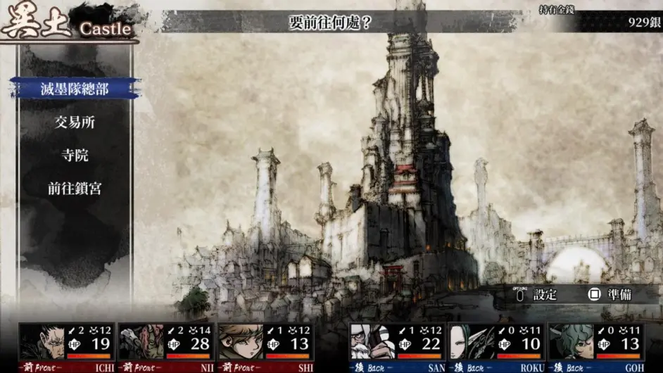 遊戲的可活動區域包括了城鎮(功能性設施)和外部地牢兩個部分,有那麼一丟丟像是《暗黑地牢》的感覺。比如同樣是存在購買裝備的交易所、復活&接觸墨水污穢(被部分敵人攻擊會積累的負面狀態,會減少生命上限)的寺院、招募新兵的總部:當然,本作的設施類型少很多,也不存在建設和養成要素。值得一提的大概有兩點: